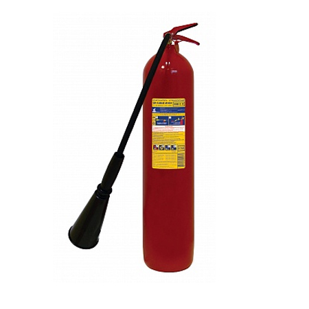 Огнетушитель, углекислотный общей массой 13,5 кг, из них масса огнетушащего вещества составляет 5 кг. Данный тип огнетушителя применяется для тушения пожаров в помещениях общей площадью 50 кв. метров