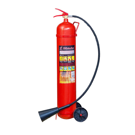 Перевозимый углекислотный огнетушитель марки "Иней" (имеются колеса для перемещения) для защиты от пожара зданий и помещений общей площадью от 100 м.кв. Масса заряженного огнетушителя составляет 40 кг., из них масса огнетушащего вещества составляет 10 кг.