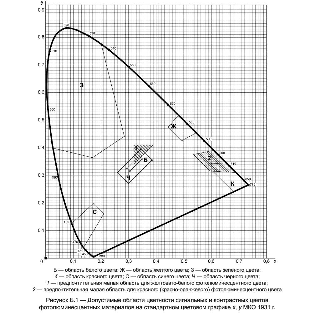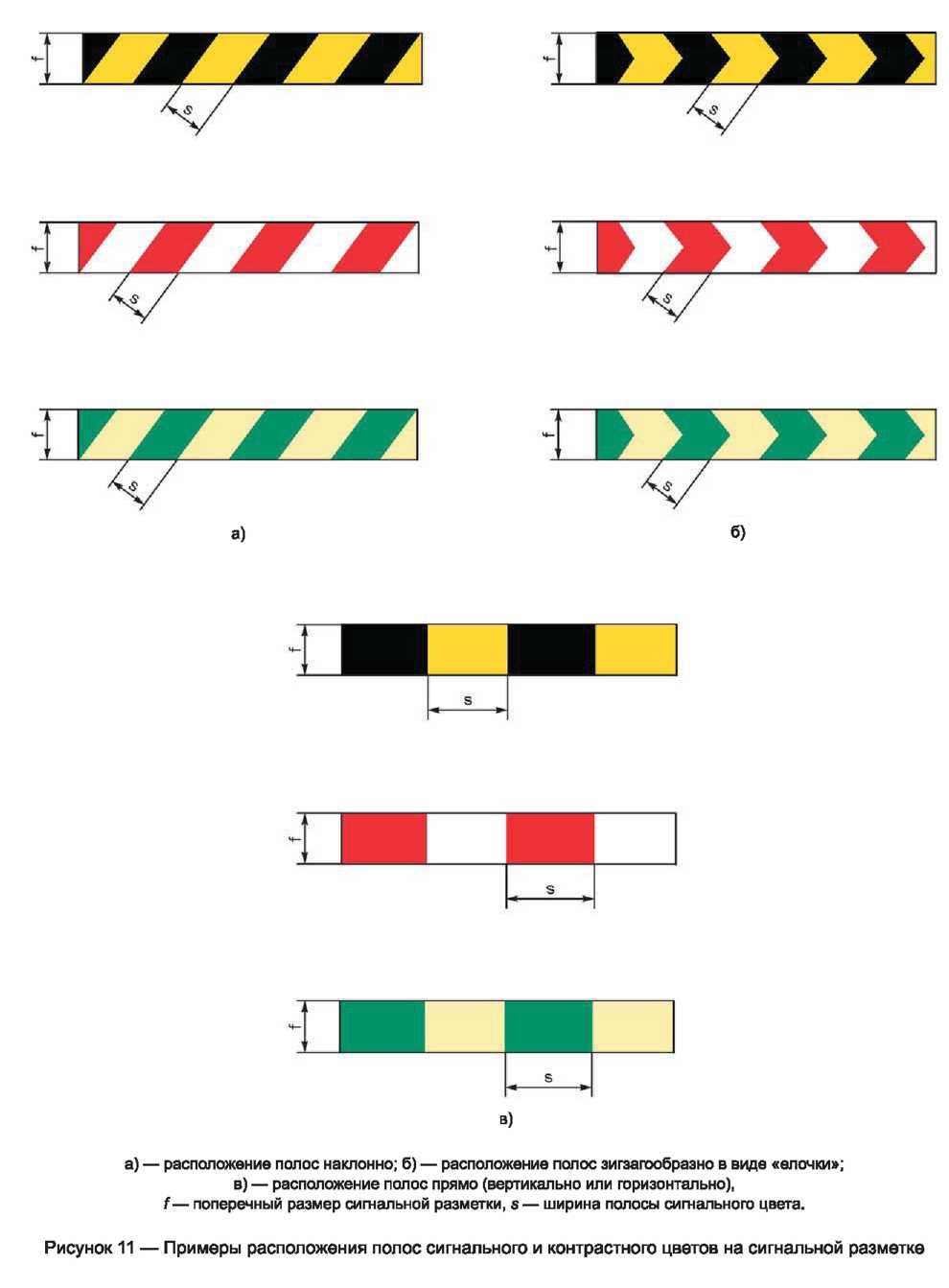 Настоящий стандарт устанавливает следующие сигнальные цвета: красный, желтый, зеленый, синий. Для усиления зрительного восприятия цветографических изображений знаков безопасности и сигнальной разметки сигнальные цвета следует применять в сочетании с контрастными цветами — белым или черным. Контрастные цвета необходимо использовать для выполнения графических символов и поясняющих надписей.