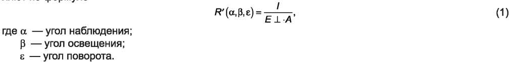 3.13 коэффициент световозвращения /?, кд/(лк-м2) или мкд/(лк-м2): Отношение силы света /, отраженного световозвращающим материалом в направлении, противоположном направлению падения света, к освещенности поверхности Е1 по нормали и освещенной площади поверхности А; определяют по формуле: