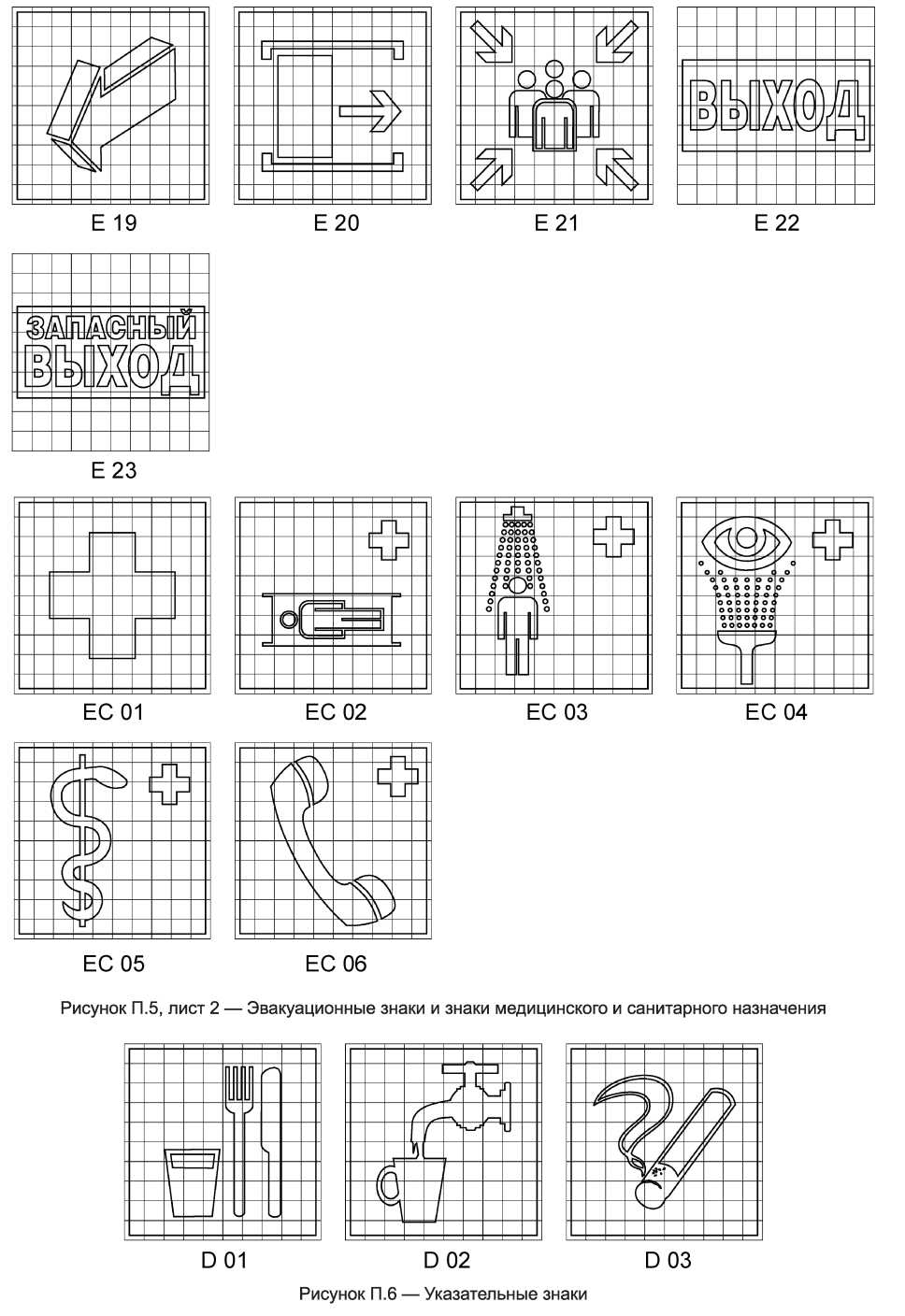 Текст знака Е23 «Указатель аварийного выхода» изменен с «Запасный выход» на «Аварийный выход».