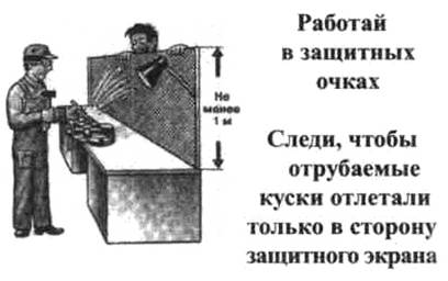 30. При работе инструментом ударного действия (рубке, клепке и других работах, при которых возможно образование отлетающих твердых частиц) следует пользоваться защитными очками или лицевым щитком, место работы оградить переносными щитами, сетками, чтобы не допустить вылет осколков в сторону рабочих мест, проходов и проездов.